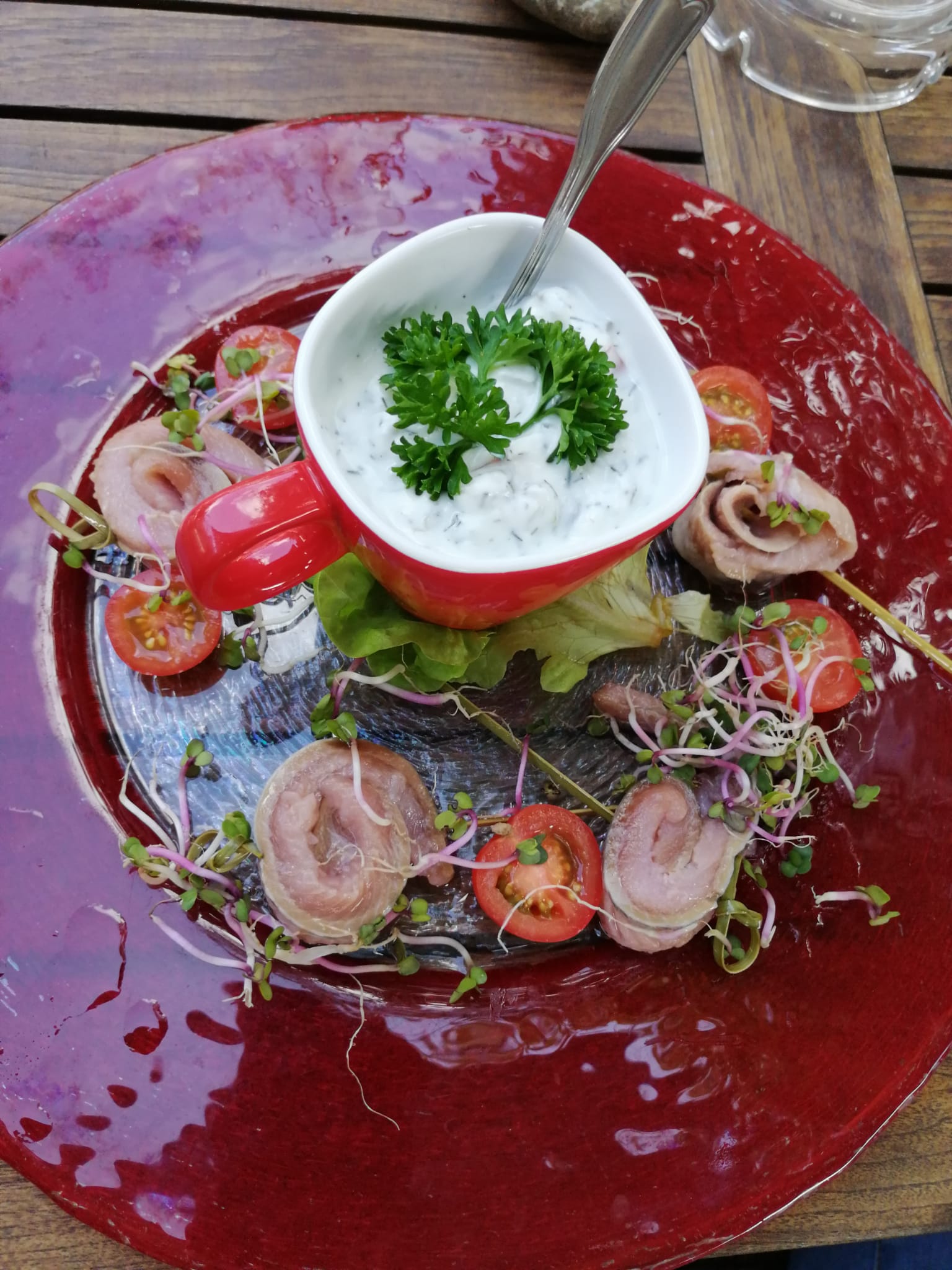 Hier laben wir uns erst mal am leckeren Matjesbrötchen.